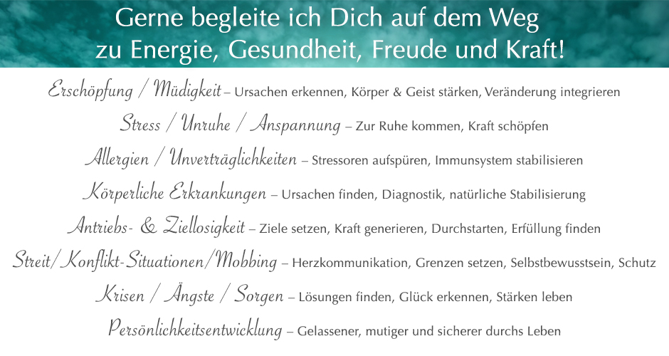 Gemeinsam suchen wir nach den Ursachen der Erschöpfung, die in zehrenden Erkrankungen genauso wie in Mangel an Nähr- oder Vitalstoffen, Zähnen, Hormonschwankungen, Allergien, Ernährung, Bewegungsmangel, Umweltbelastungen aber auch in Ängsten, Konflikten und Sorgen liegen können.